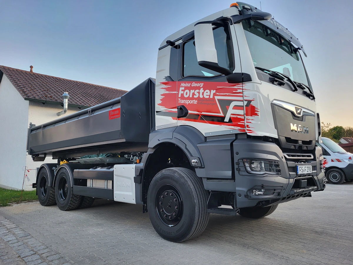 2-Achs Selbstlader (Dreiseitenkipper) zul. Gesamtgewicht:18to, Motorleistung von 313PS bis 410PS, Ladekran max. Reichweite 9,3m; Hubkraft bei max. Reichweite: 960kg, Zweischalengreifer |